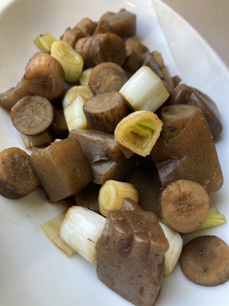 こんにゃくゴボウ葱の煮物 材料とした処理 こんにゃく2/3枚2㎝角に切る ごぼう1/2本7mm...