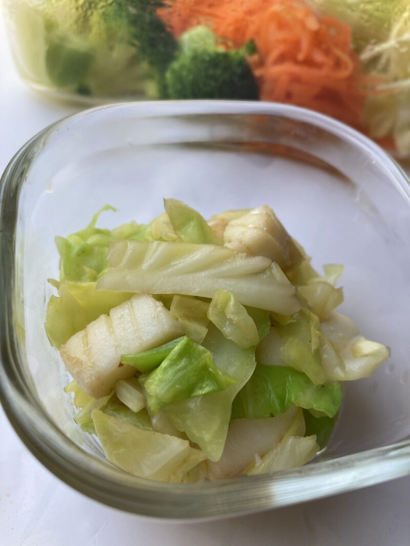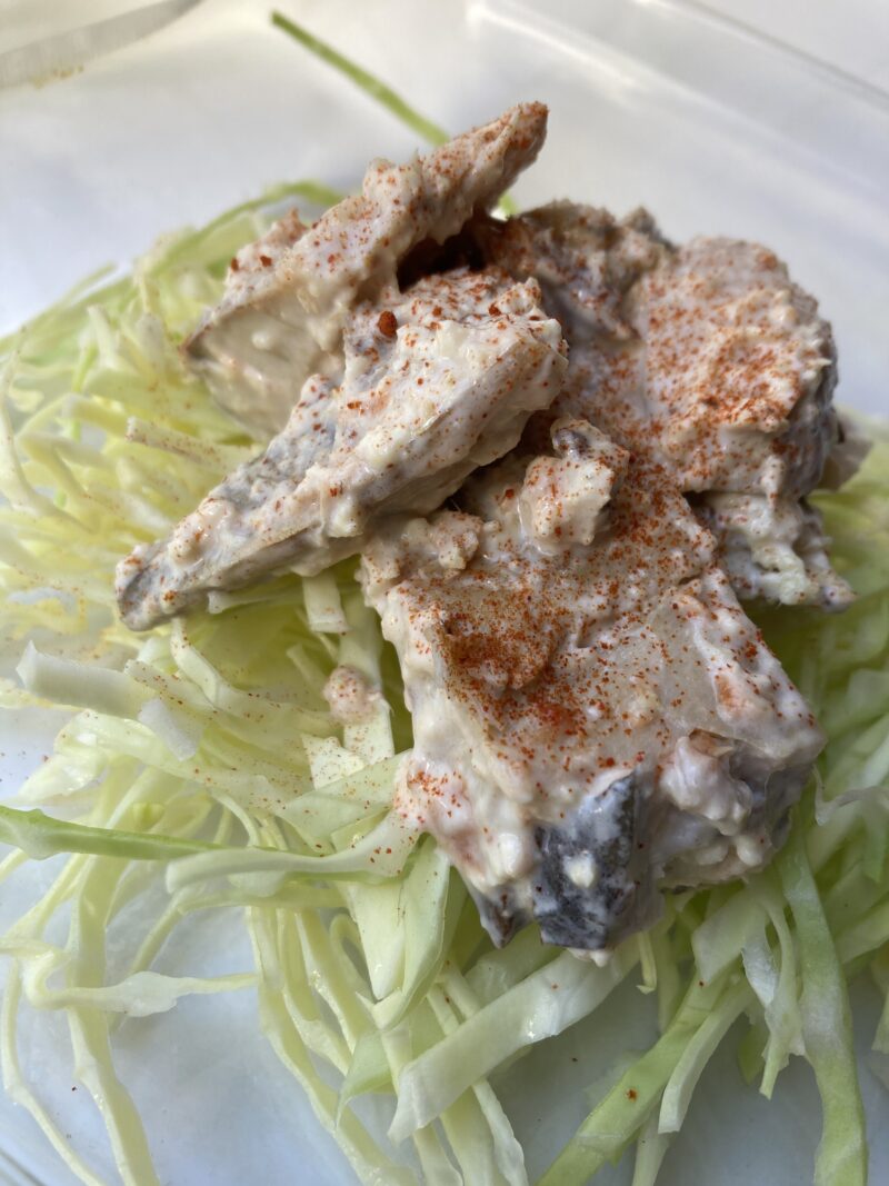 鯖マヨ 材料 生活クラブ冷凍骨抜きサバ一袋 マヨネーズ大さじ1 しょうが一かけ きゃべつ千...