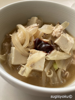 右夫用 豚肉・豆腐・玉ねぎ・ねぎ・さば缶少し・コチュジャン