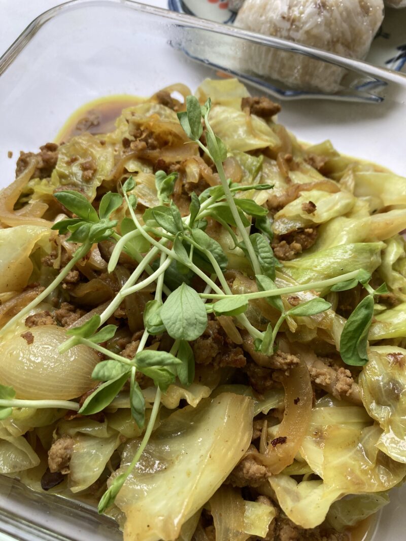 にんにく・ひき肉・玉ねぎを炒め、キャベツとワインも投入