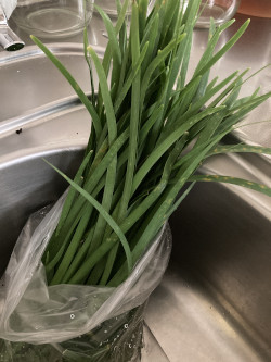 切り分けたニラと豚肉を入れ熱したフライパンで