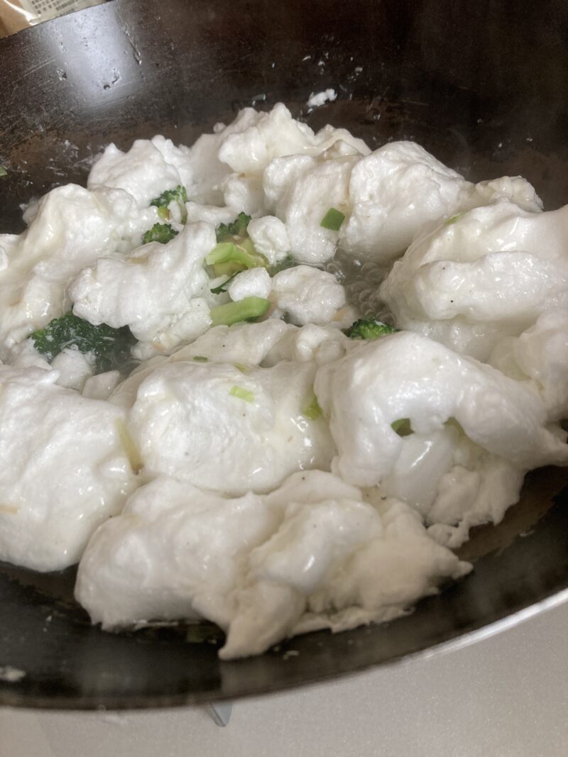 沸騰したら水溶き片栗粉でとろみをつけめ、ブロッコリー