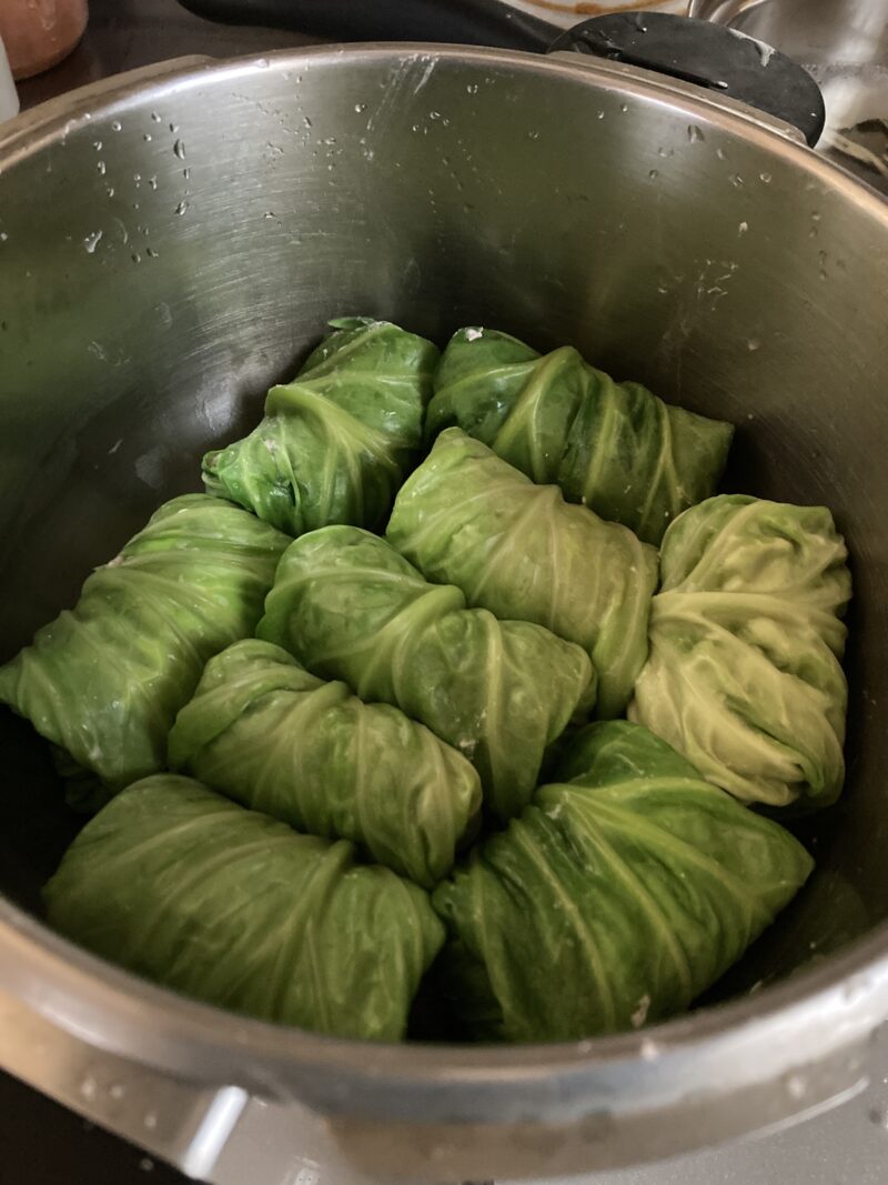 攪拌し、9等分し、軽く茹でて冷ましたキャベツで包み