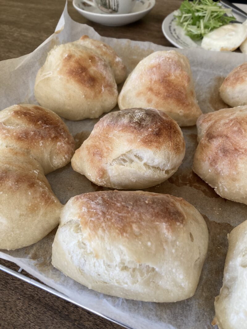 温湯を入れて混ぜ、ボールの縁に生地を伸ばし