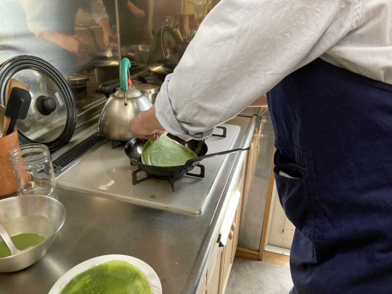 5月大人のレッスン 全て終了いたしました。 今月もありがとうございます。 抹茶のクレープも仕上げており 薄焼き卵を作るよう要領で焼き上げ 出来立ては生地だけも美味しい♬ 小豆を挟んでいただいても美味しい♬♬