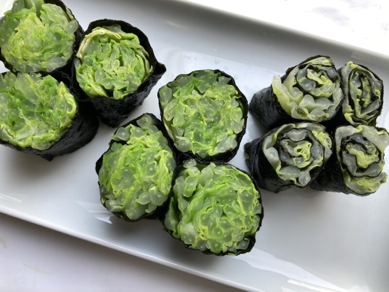 軽く茹でてぎゅっと絞り、海苔一枚手前にのせ海苔を巻き込まずに