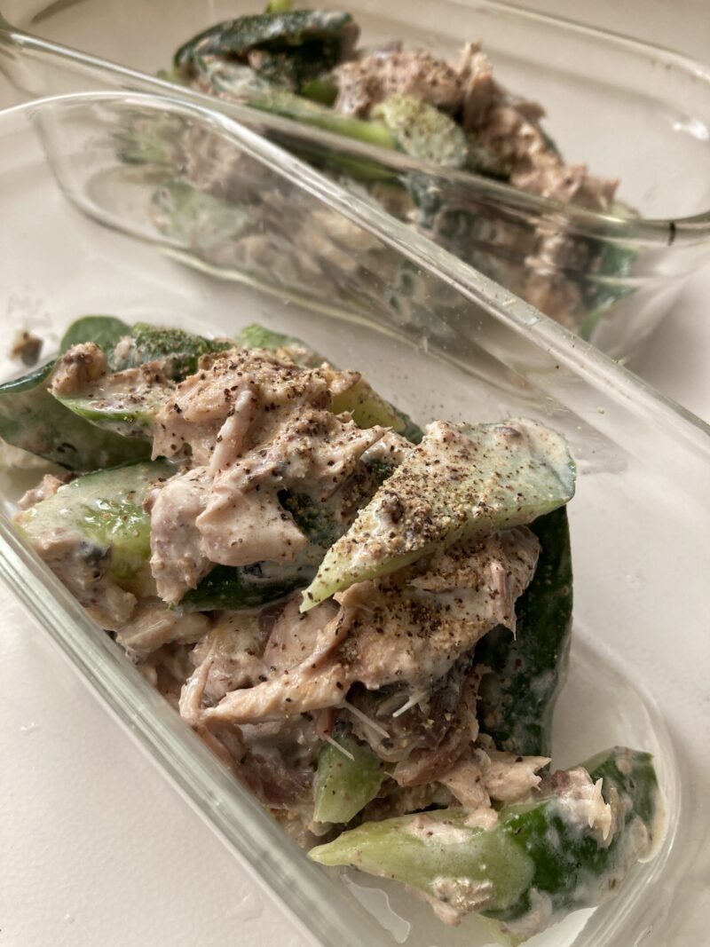 しばらくおいてぎゅっと絞り、さば缶、マヨネーズ、こしょうと和えました。