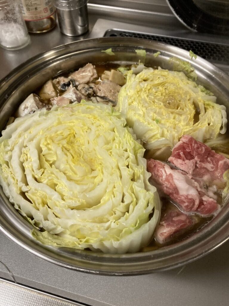 沸いたところへ、豚肉・鯖缶・高野豆腐を入れ
