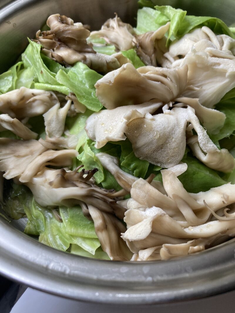鍋にサケ、しょうが、きゃべつ、マイタケ、酒大さじ1と水を入れ