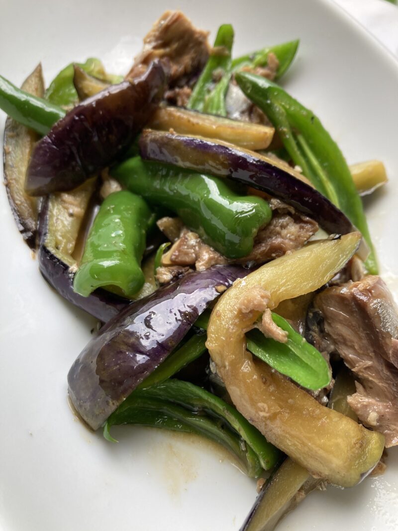 秋ナスと万願寺とうがらしと鯖缶の炒め物