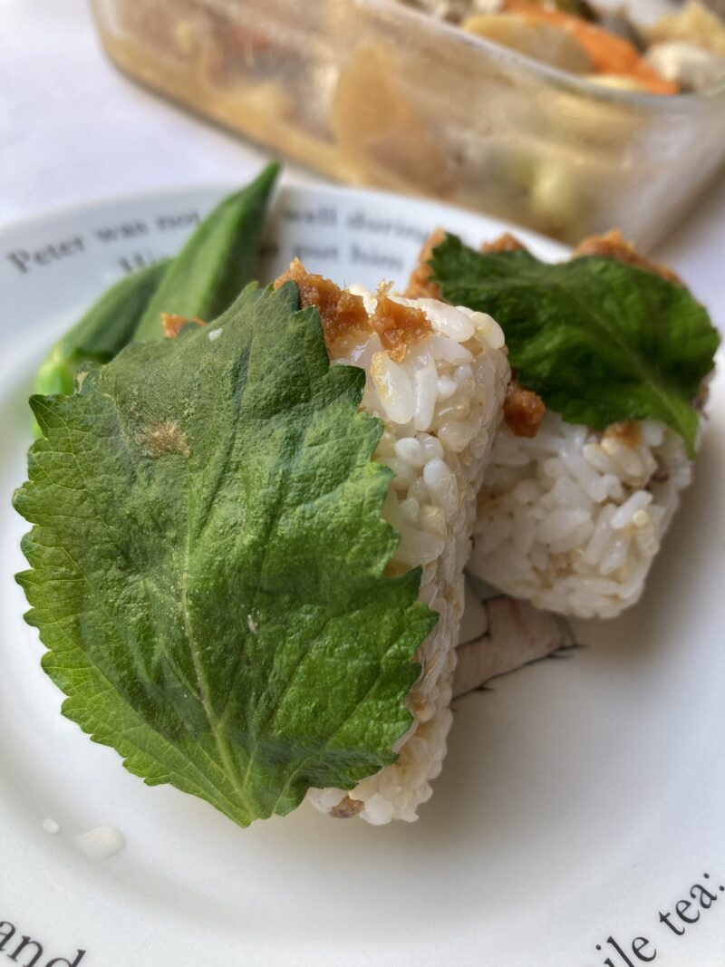 おにぎりに、味噌を塗り、その上から青しそを