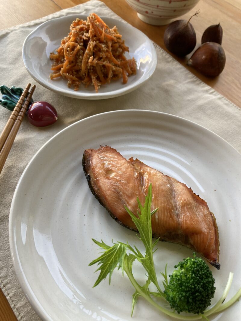 鮭つけ焼きと人参のゴマ和え